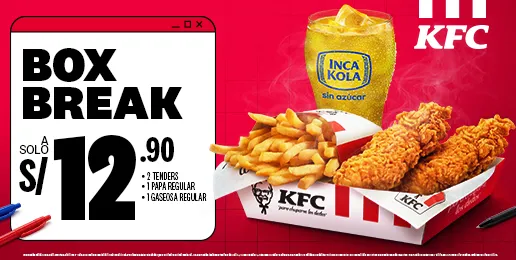 BOX BREAK: Contenido : 2 tenders de pollo, 1 papa regular y 1 gaseosa regular a s/12.90.