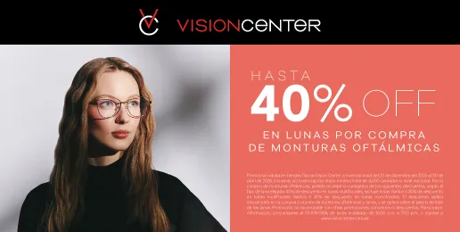 Promoción válida en tiendas físicas Vision Center a nivel nacional del 01 al 30 de abril de 2026, inclusive, y/o hasta agotar stock mínimo total de 4,000 unidades a nivel nacional. Por la compra de monturas oftálmicas, podrás acceder a cualquiera de los siguientes descuentos, según el tipo de luna elegida: 40% de descuento en lunas multifocales, excluye lunas Varilux ó 30% de descuento en lunas multifocales Varilux ó 30% de descuento en lunas monofocales. El descuento aplica únicamente en la compra conjunta de monturas oftálmicas y lunas, y se aplica sobre el precio de lista de las lunas. Promoción no acumulable con otras promociones, convenios ni descuentos. Para mayor información, comuníquese al 01-319-0134, de lunes a sábado de 10:00 a.m. a 7:00 p.m., o ingrese a www.visioncenter.com.pe
