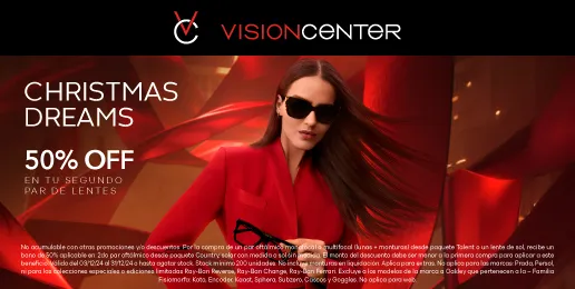No acumulable con otras promociones y/o descuentos. Por la compra de un par oftálmico monofocal o multifocal (lunas + monturas) desde paquete Talent o un lente de sol, recibe un bono de 50% aplicable en: 2do par oftálmico desde paquete Country, solar con medida o sol sin medida. El monto del descuento debe ser menor a la primera compra para aplicar a este beneficio. Válido del 03/12/24 al 31/12/24 o hasta agotar stock. Stock mínimo 200 unidades. No incluye monturas en liquidación. Aplica para extras. No aplica para las marcas: Prada, Persol, ni para las colecciones especiales o ediciones limitadas Ray-Ban Reverse, Ray-Ban Change, Ray-Ban Ferrari. Excluye a los modelos de la marca a Oakley que pertenecen a la – Familia Fisiomorfa: Kato, Encoder, Kaast, Sphera, Subzero, Cascos y Goggles. No aplica para web.